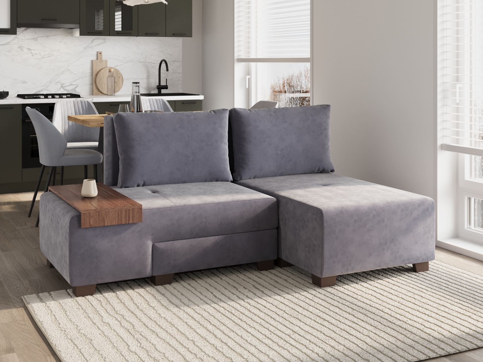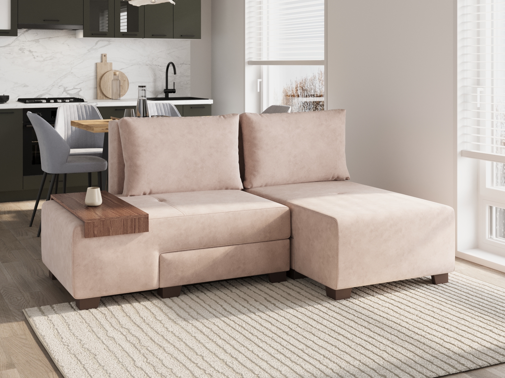 Обратите внимание, что можно выбрать комплектацию дивана: с валиком, столиком или без дополнительных элементов.
