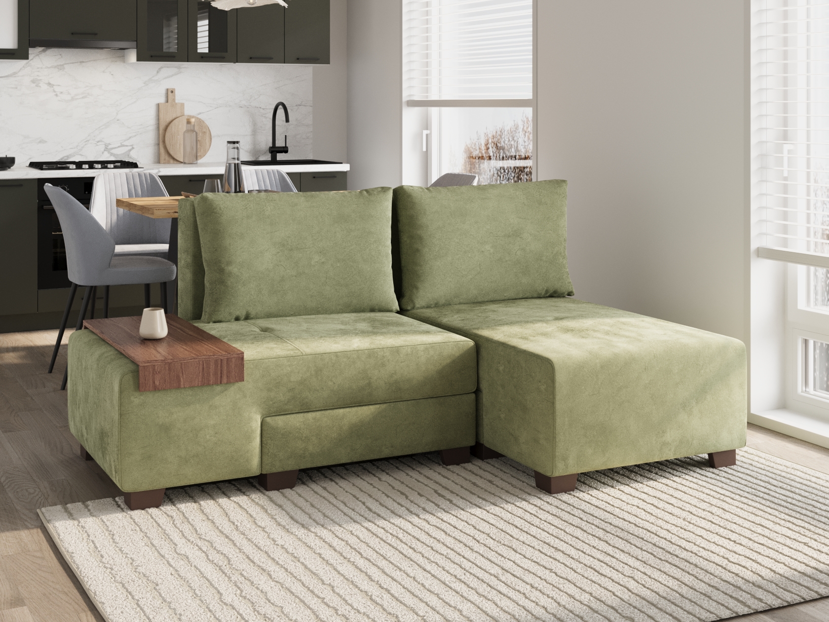 В сложенном виде модель отлично подходит для небольшой комнаты. Сиденье легко раскладывается и образует спальное место для одного человека. Невысокие ножки создают стильный акцент в интерьере. Практичный бельевой короб — важное преимущество конструкции.